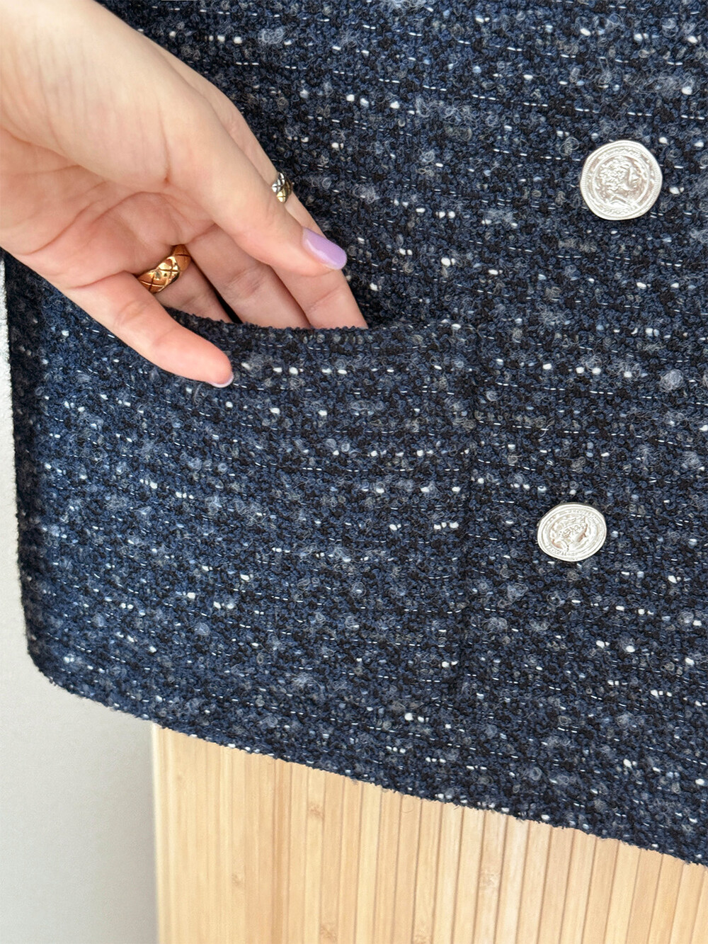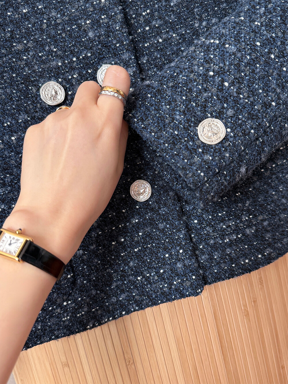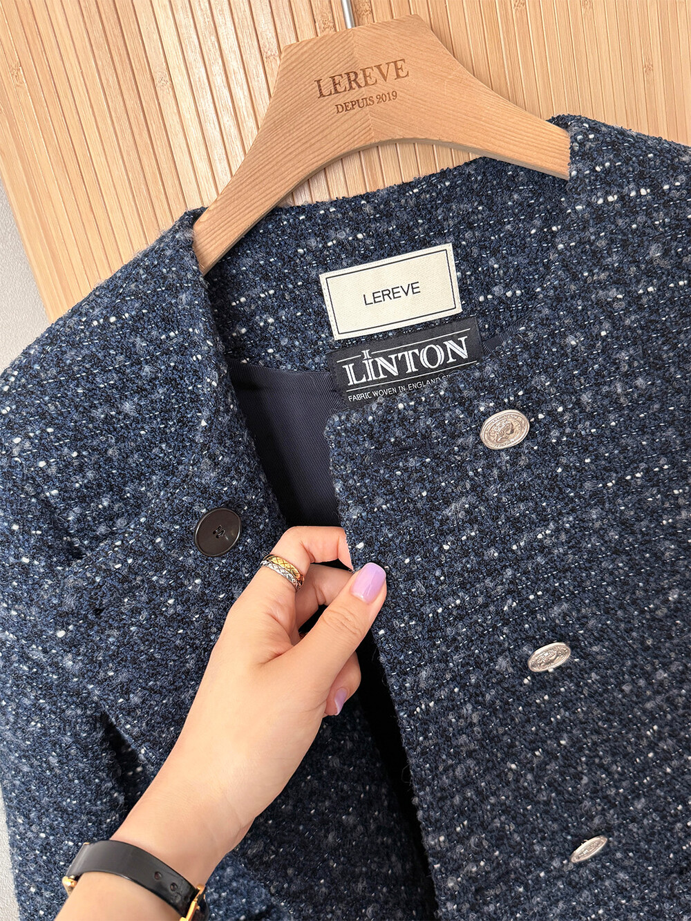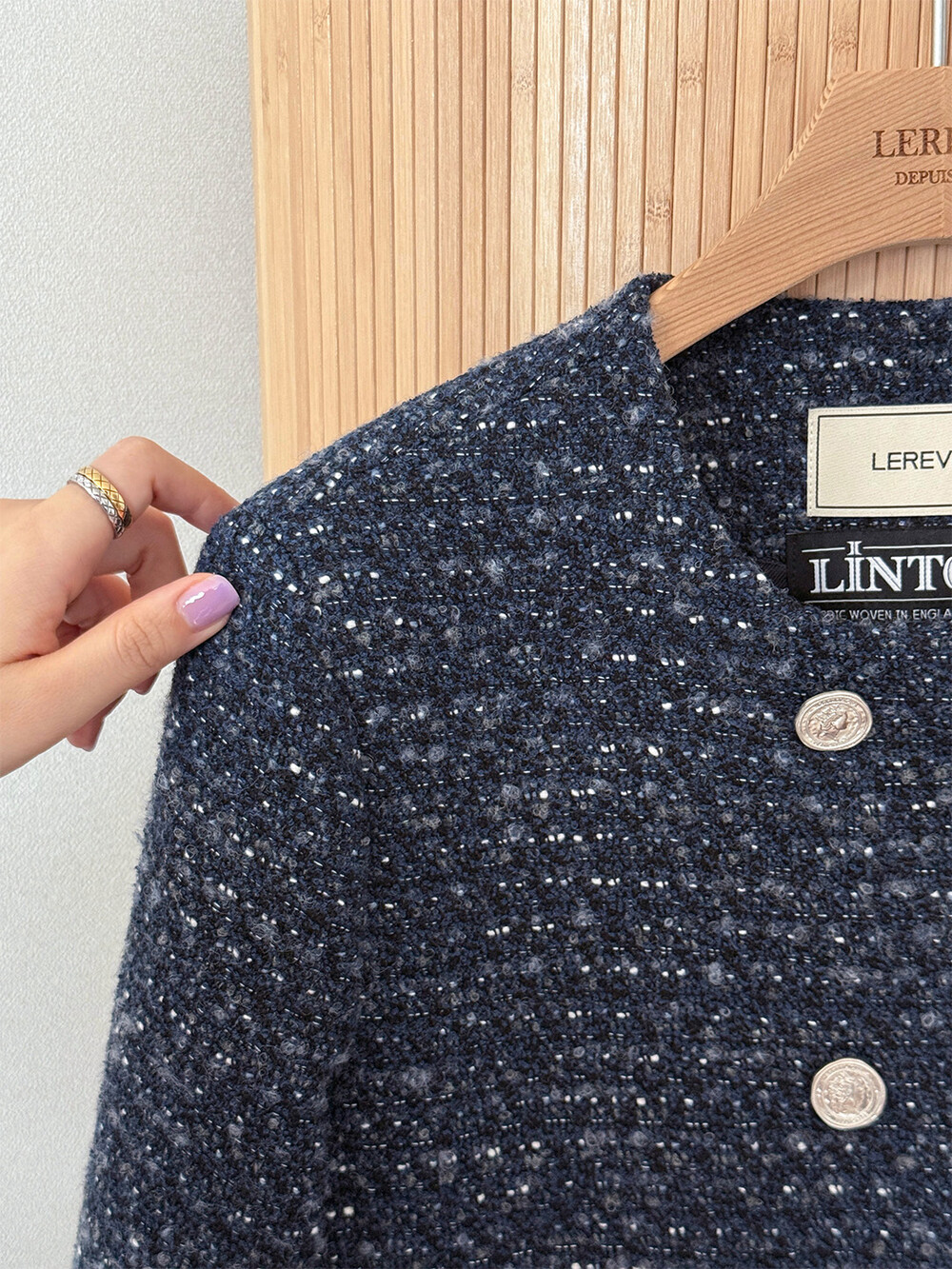 반더블 재킷, 하나의 아이템이 주는 우아하고 고유한 분위기만을 생각하며 완성하였습니다. 섬세한 네이비 트위드 위에 은장단추는 그 어떤 조합보다도 ‘깨끗하고 청아한’ 느낌을 전해줍니다.