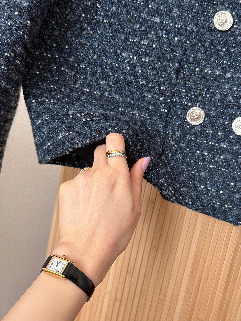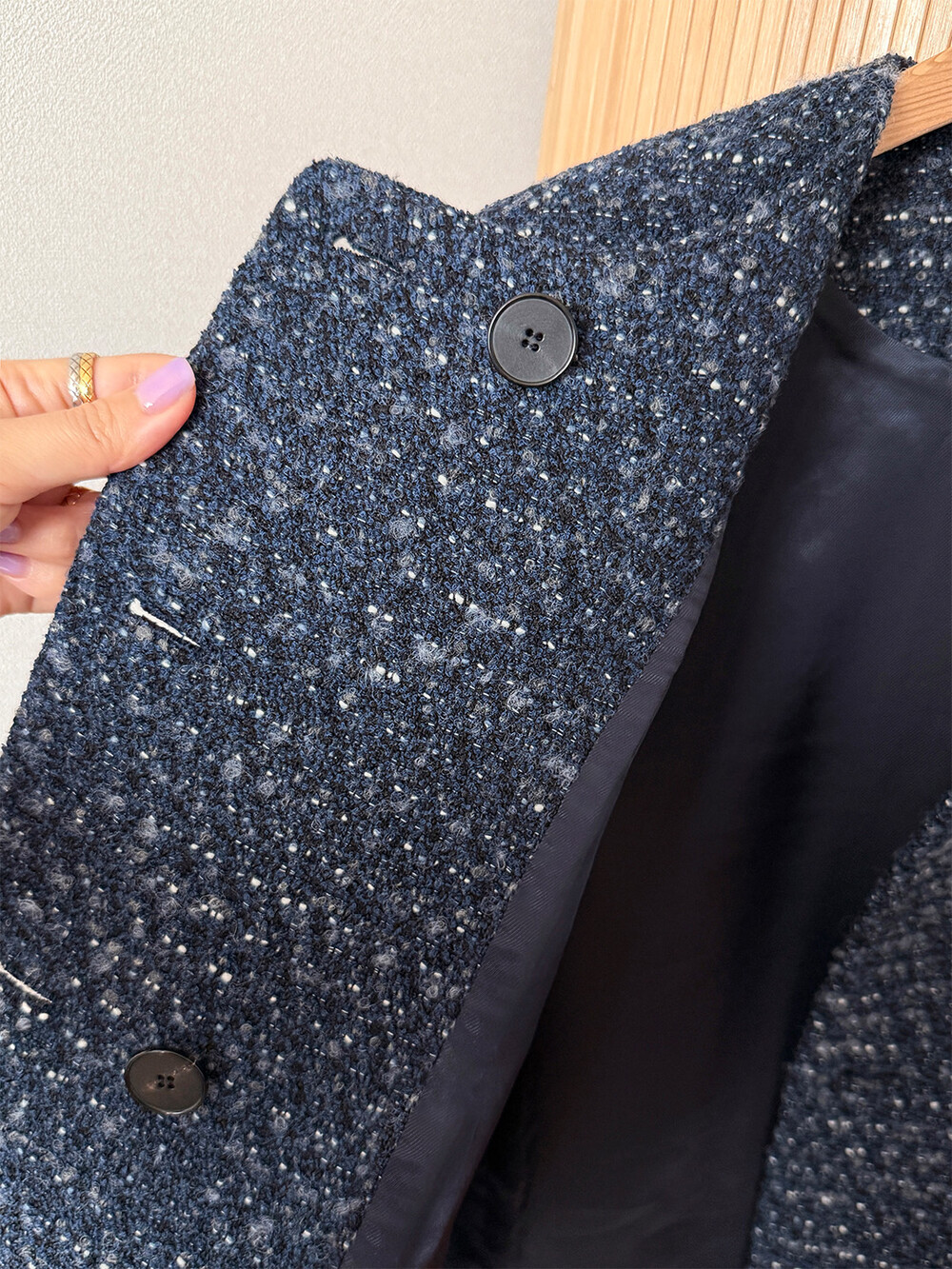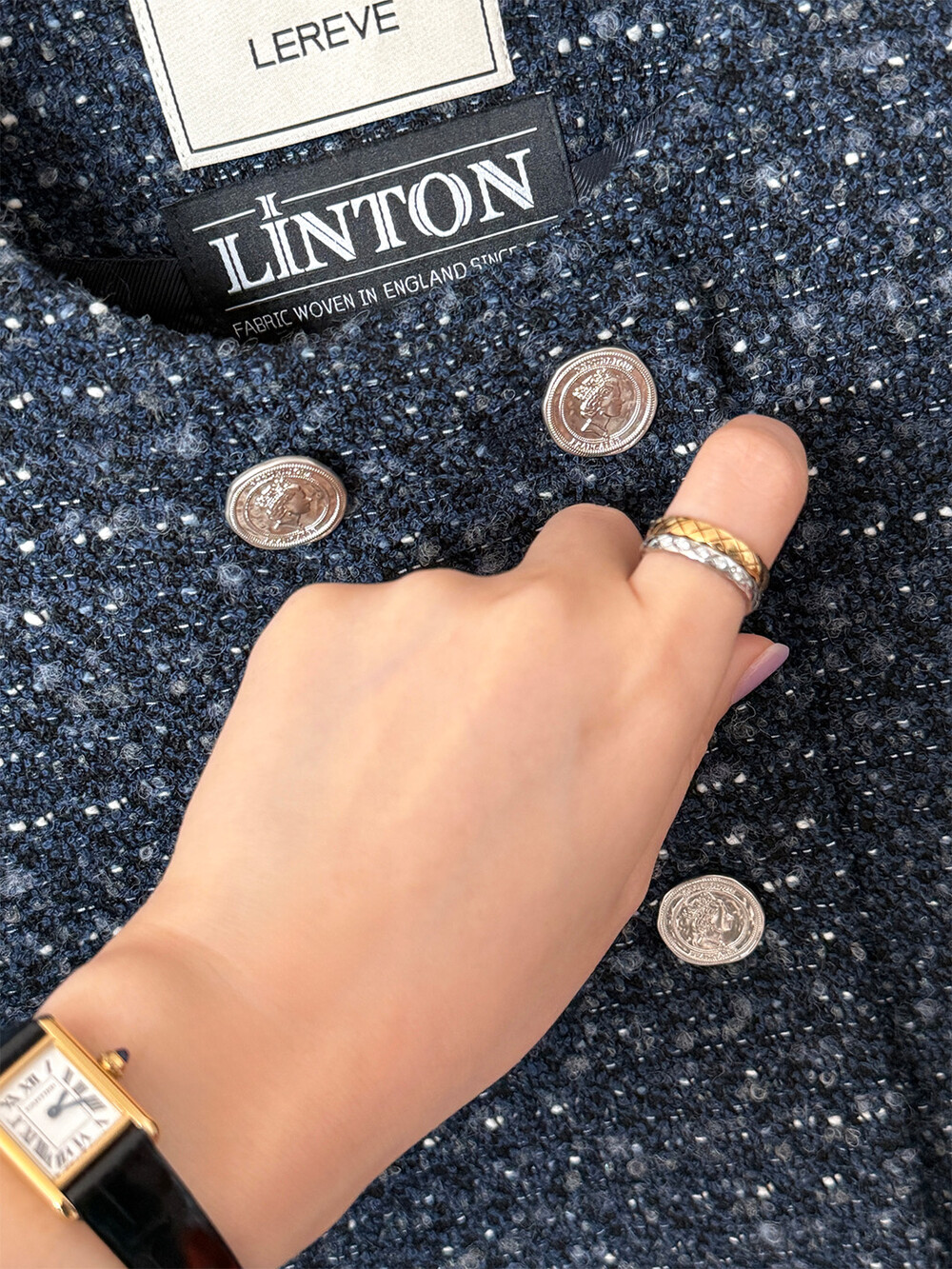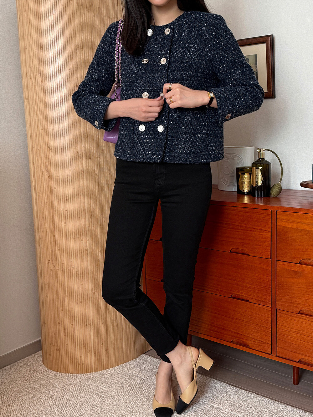 반더블 재킷, 하나의 아이템이 주는 우아하고 고유한 분위기만을 생각하며 완성하였습니다. 섬세한 네이비 트위드 위에 은장단추는 그 어떤 조합보다도 ‘깨끗하고 청아한’ 느낌을 전해줍니다.