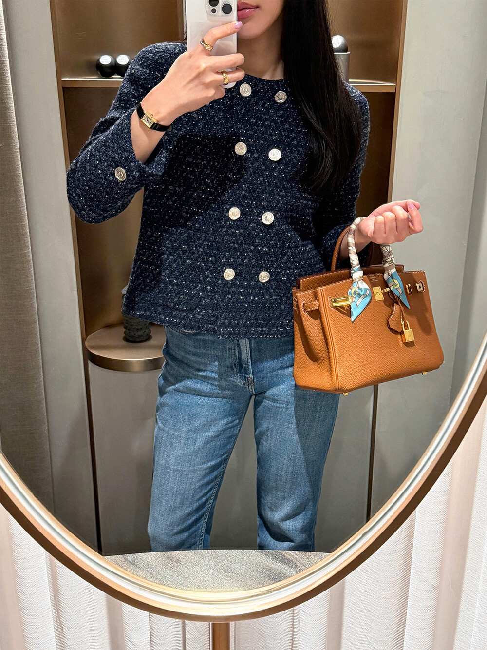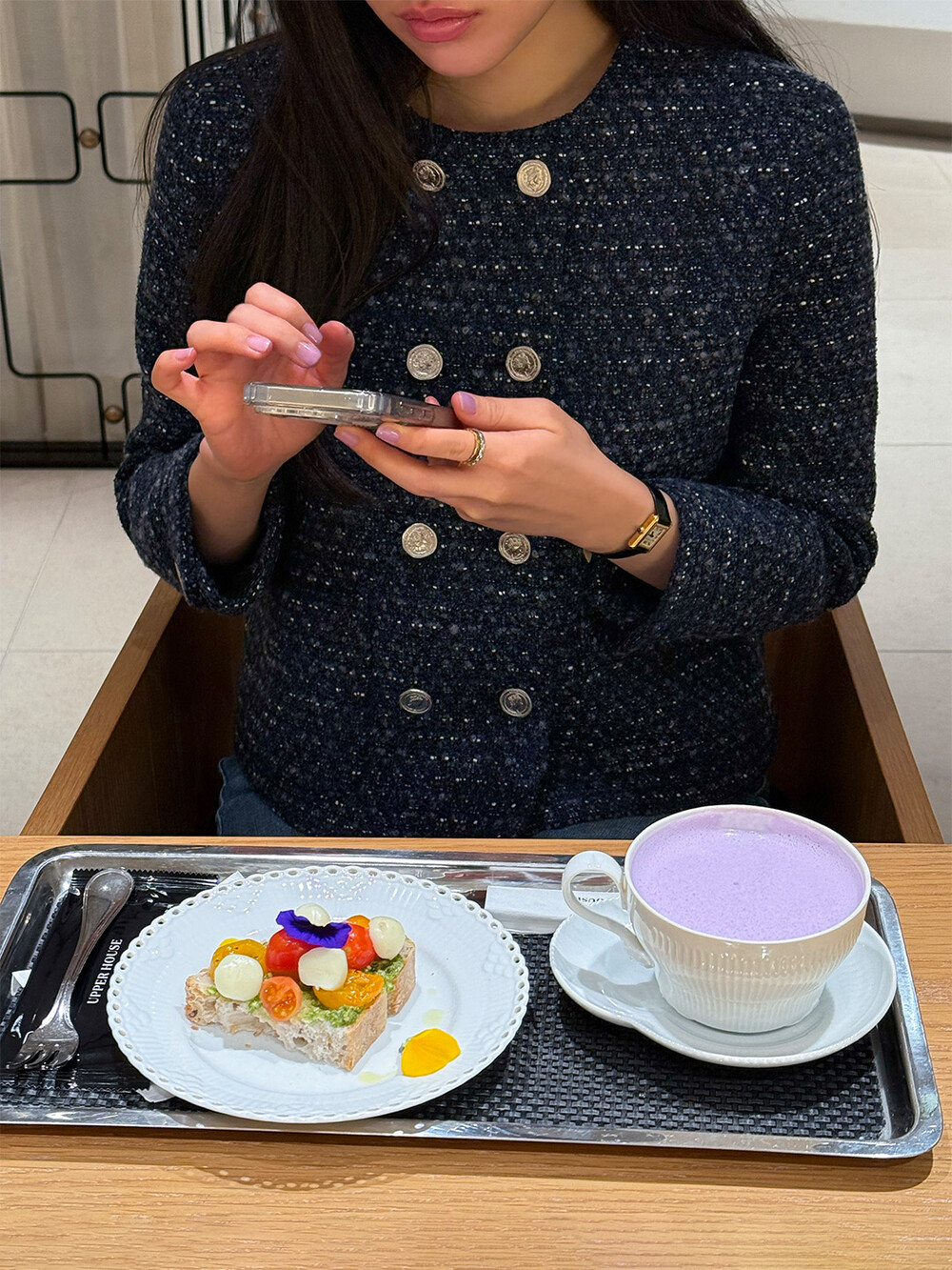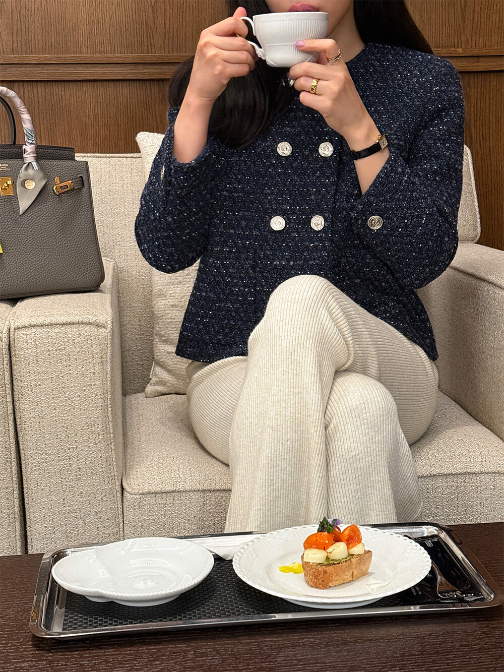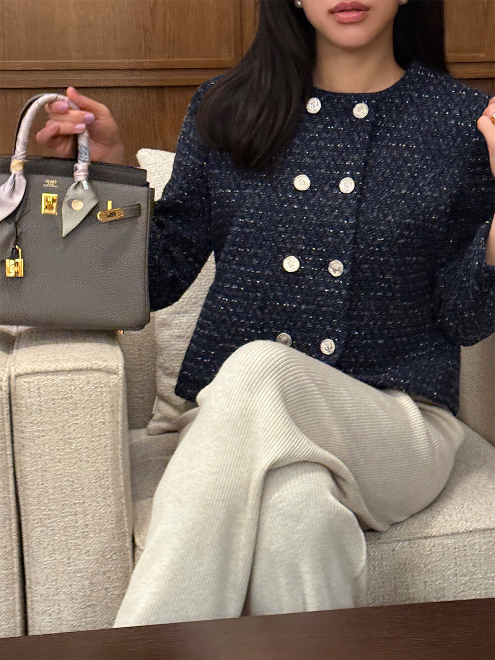 반더블 재킷, 하나의 아이템이 주는 우아하고 고유한 분위기만을 생각하며 완성하였습니다. 섬세한 네이비 트위드 위에 은장단추는 그 어떤 조합보다도 ‘깨끗하고 청아한’ 느낌을 전해줍니다.