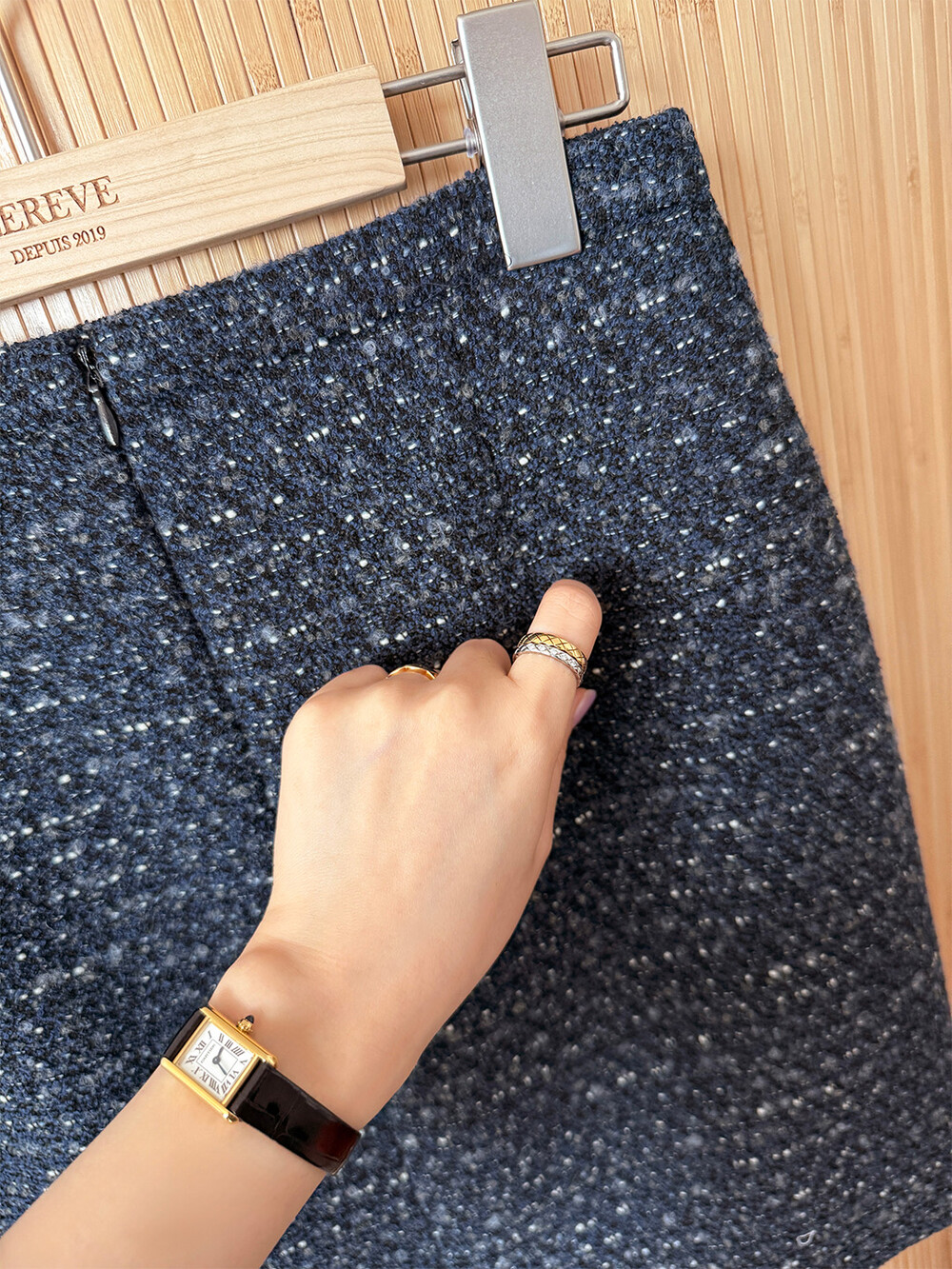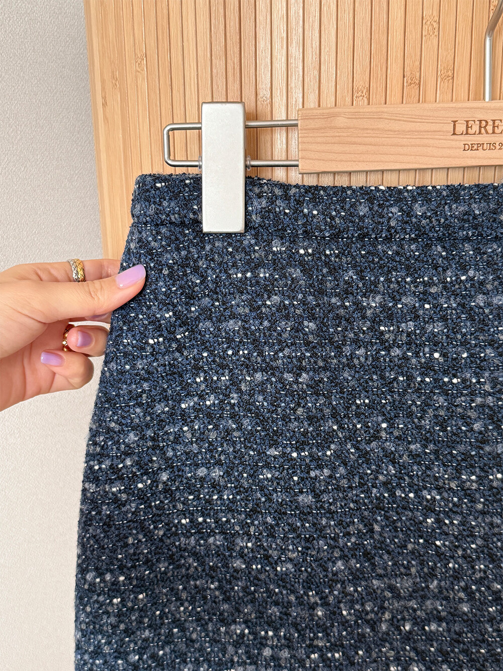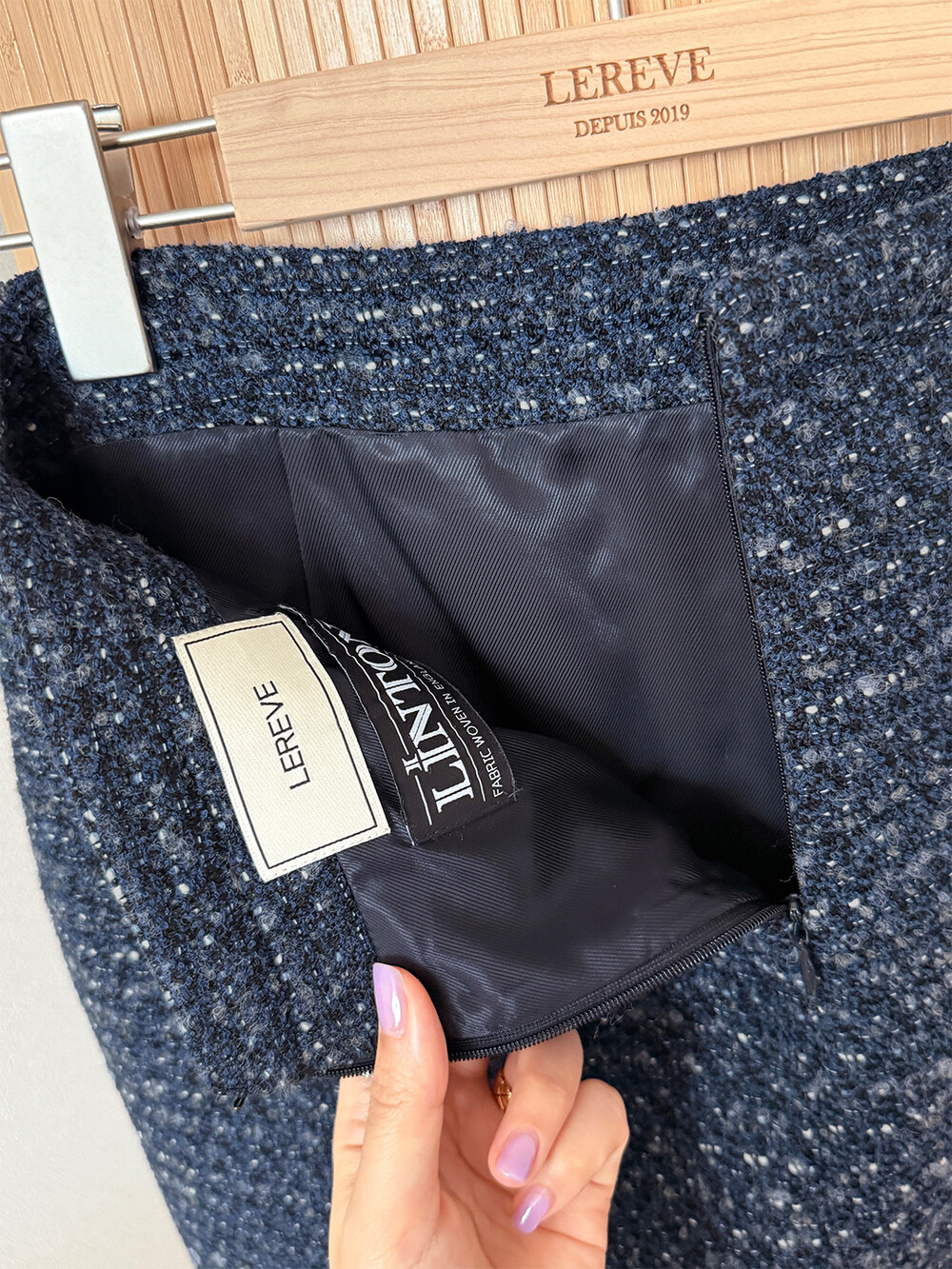 함께 제안되는 미니 세미 A라인 스커트는 린톤 트위드의 네이비 컬러가 주는 고급스러운 셋업으로 즐기면서 어느 날에는 단품으로 다양한 상의와도 매칭하여 데일리룩을 완성해 보세요.