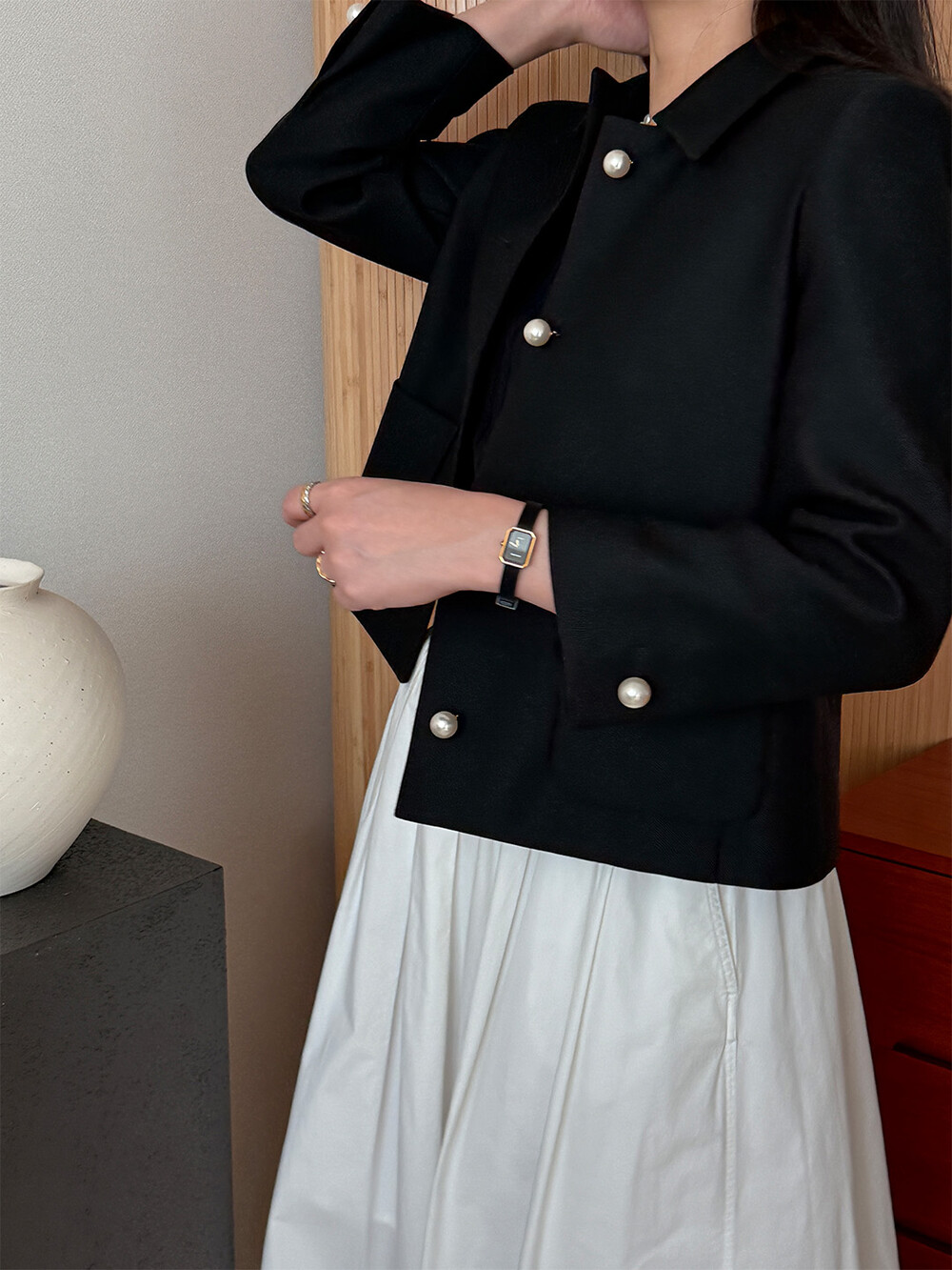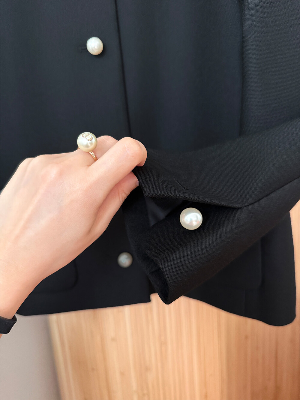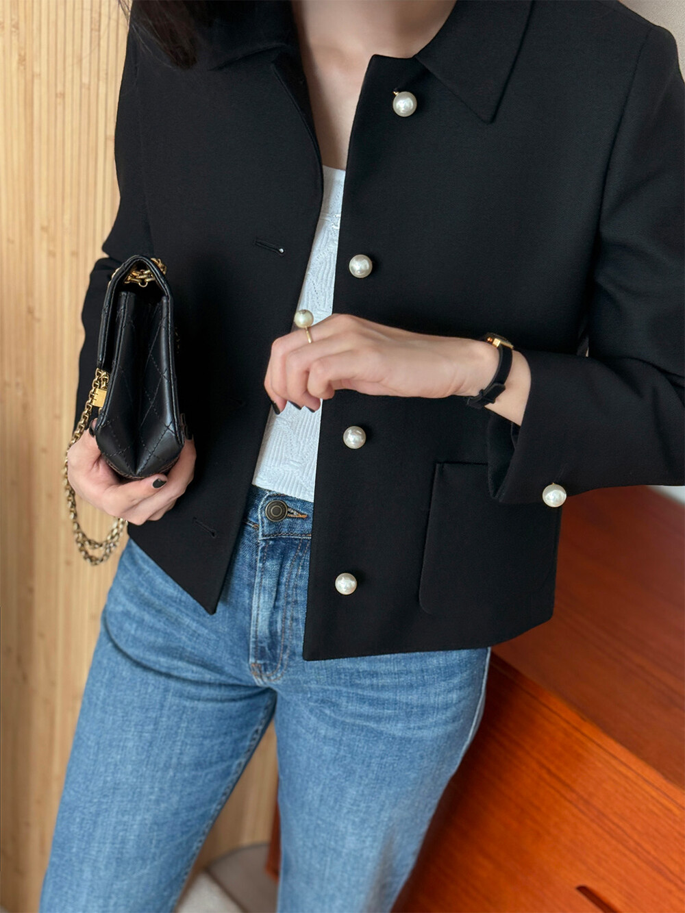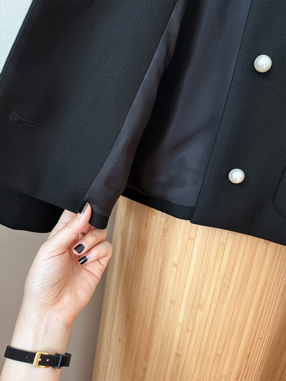재킷의 소매는 가녀린 팔목 지점에 맞춰 떨어지도록 소매기장을 완성하였으며, 평소 애용하는 시계나 브레이슬릿과 같은 액세서리를 매칭할 때 자연스러운 어울림으로 설계된 소매장입니다. 앞면 클로저 제일 첫 단추가 자리한 앞단작 끝을 다림질로 젖혀주면 자연스러운 쁘띠 카라의 형태로 전환되어 새로운 스타일로서의 활용도를 제안합니다.