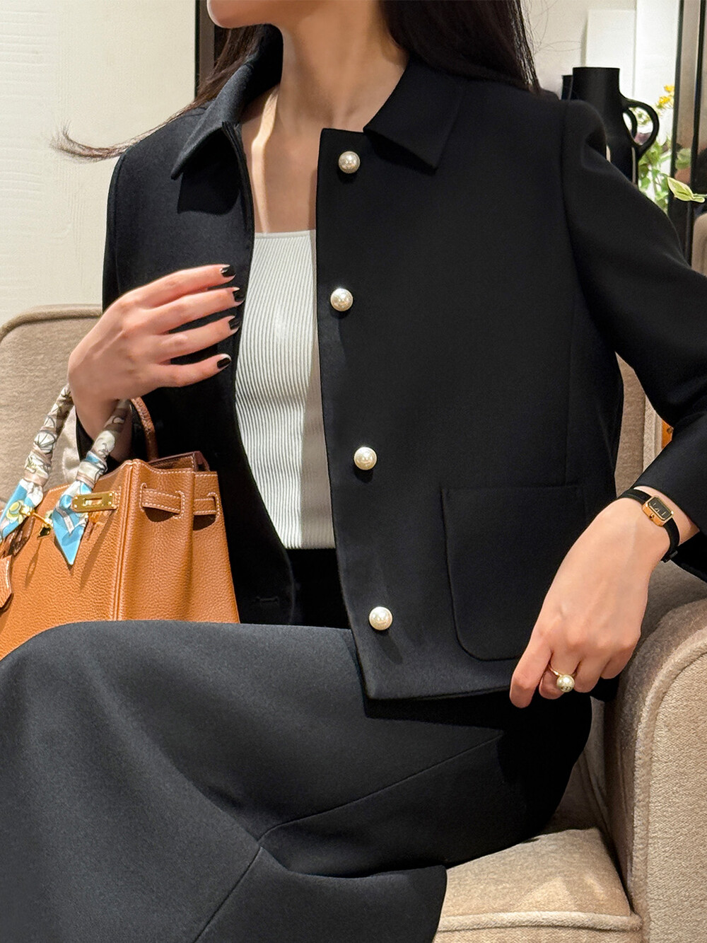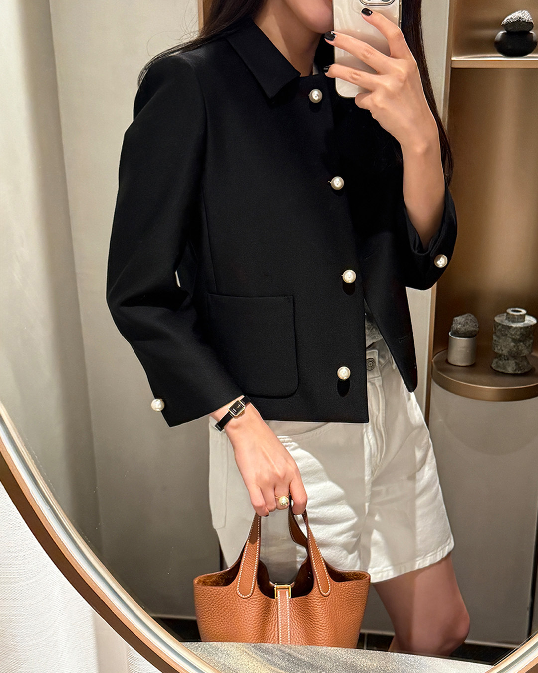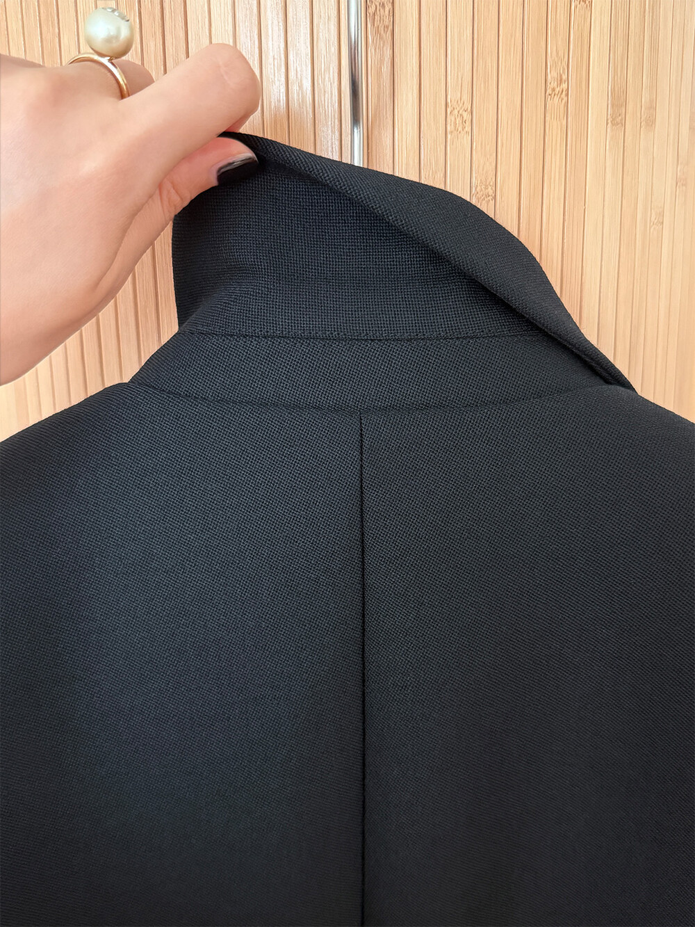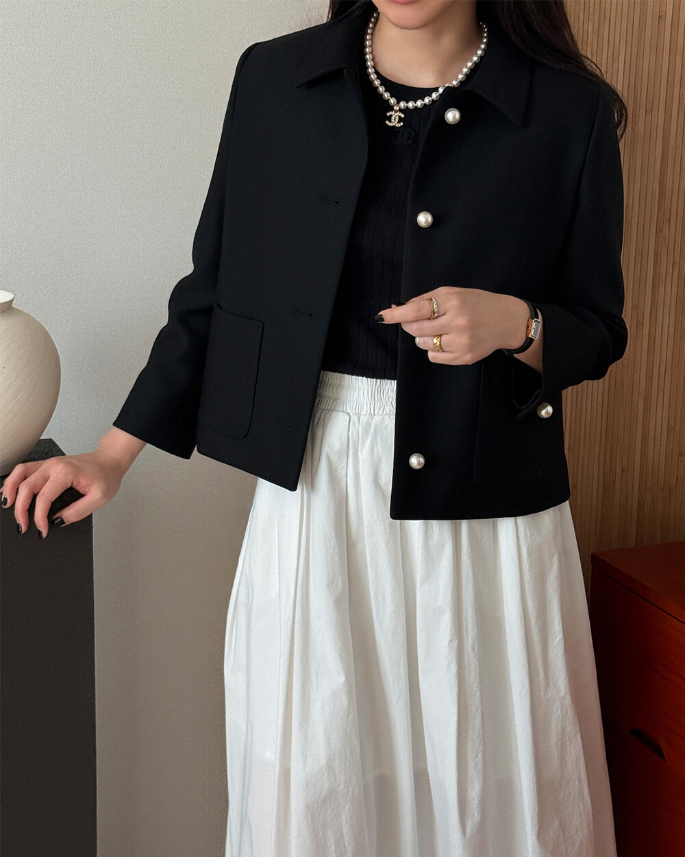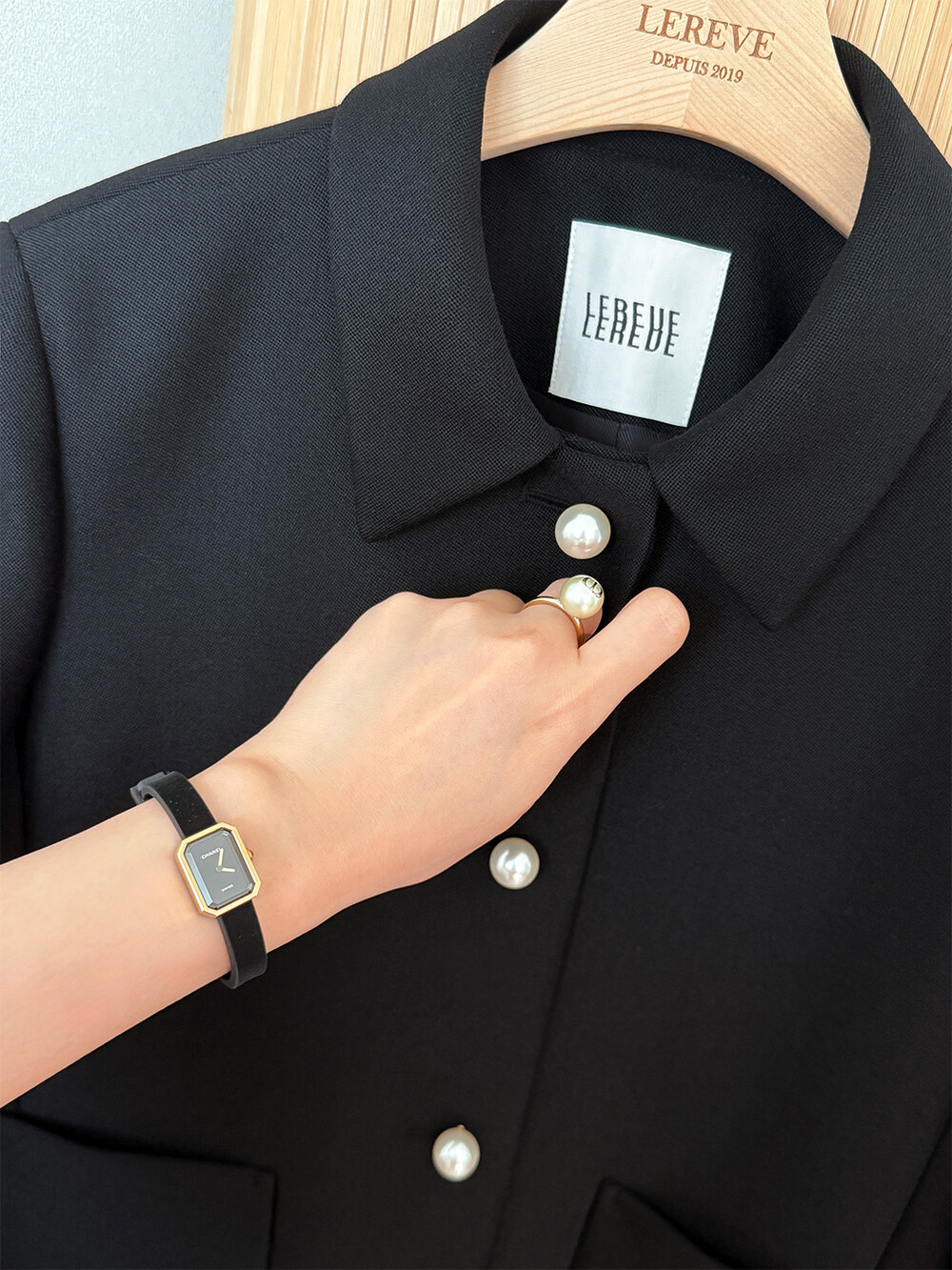 재킷의 소매는 가녀린 팔목 지점에 맞춰 떨어지도록 소매기장을 완성하였으며, 평소 애용하는 시계나 브레이슬릿과 같은 액세서리를 매칭할 때 자연스러운 어울림으로 설계된 소매장입니다. 앞면 클로저 제일 첫 단추가 자리한 앞단작 끝을 다림질로 젖혀주면 자연스러운 쁘띠 카라의 형태로 전환되어 새로운 스타일로서의 활용도를 제안합니다.