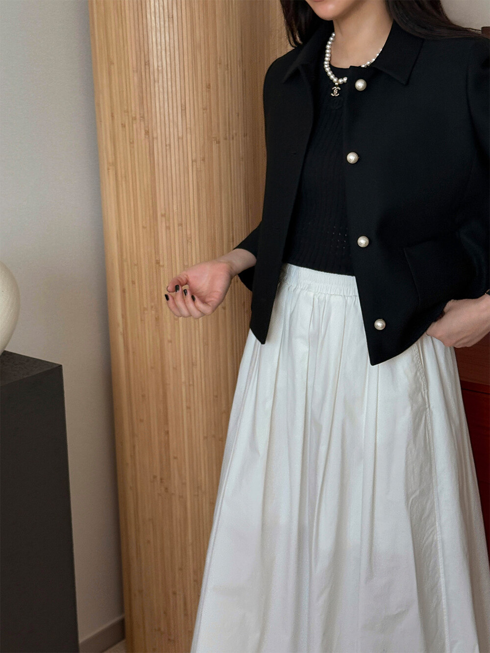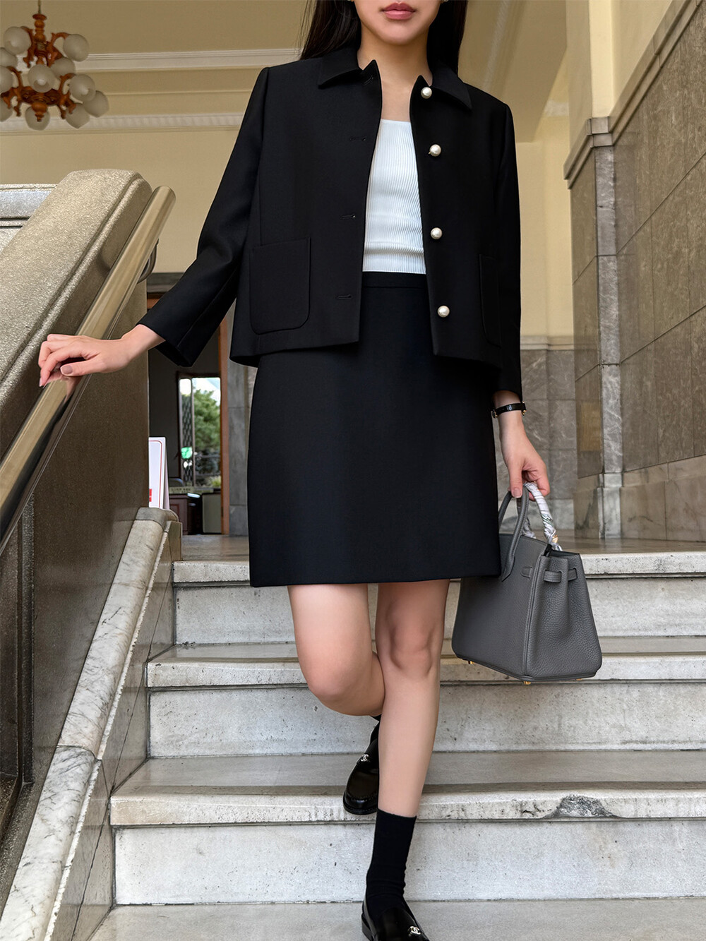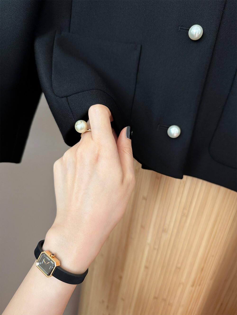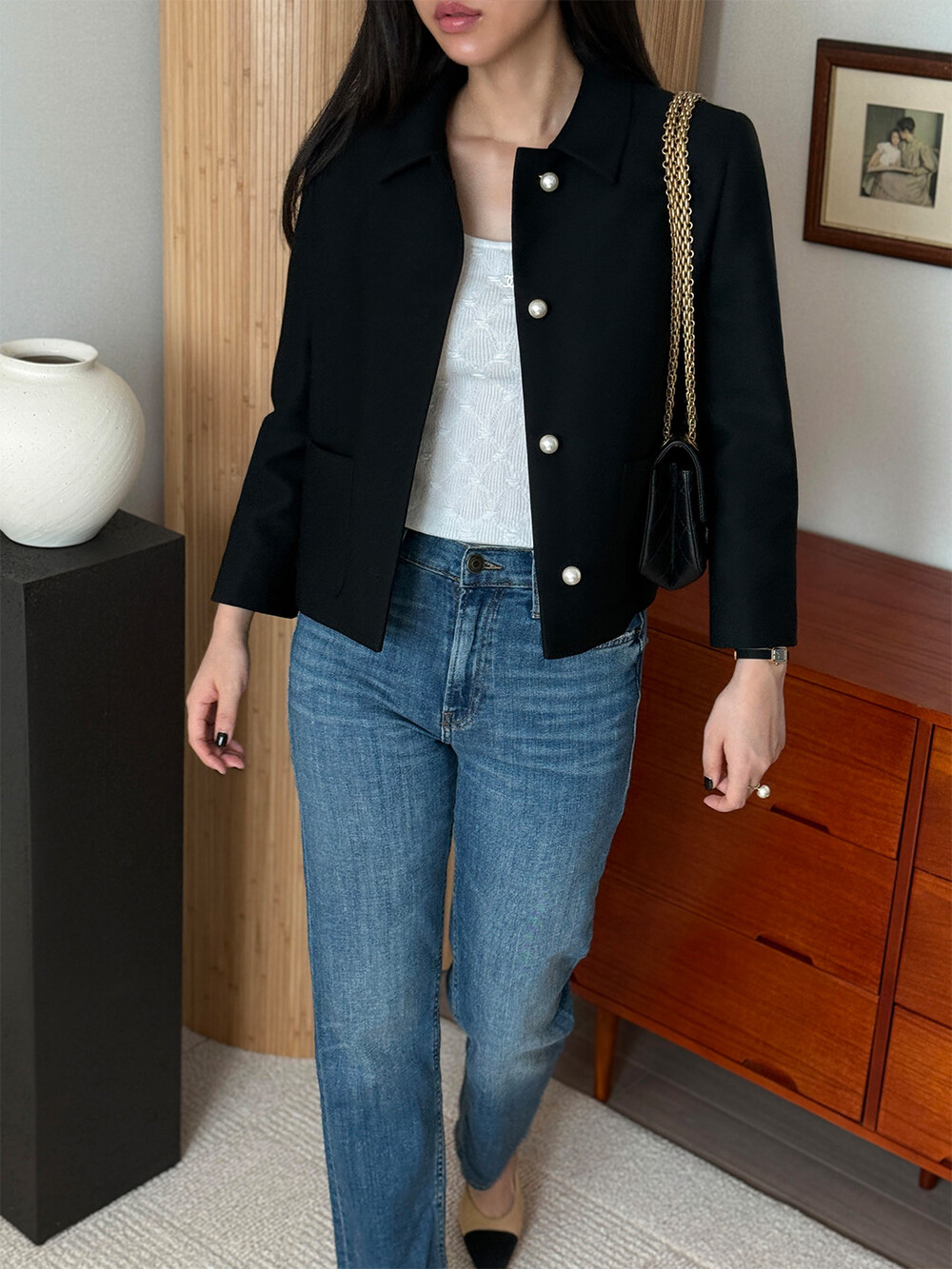 재킷의 소매는 가녀린 팔목 지점에 맞춰 떨어지도록 소매기장을 완성하였으며, 평소 애용하는 시계나 브레이슬릿과 같은 액세서리를 매칭할 때 자연스러운 어울림으로 설계된 소매장입니다. 앞면 클로저 제일 첫 단추가 자리한 앞단작 끝을 다림질로 젖혀주면 자연스러운 쁘띠 카라의 형태로 전환되어 새로운 스타일로서의 활용도를 제안합니다.