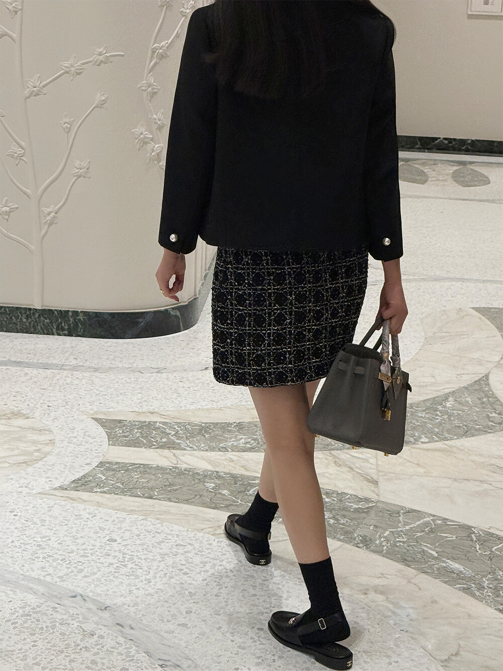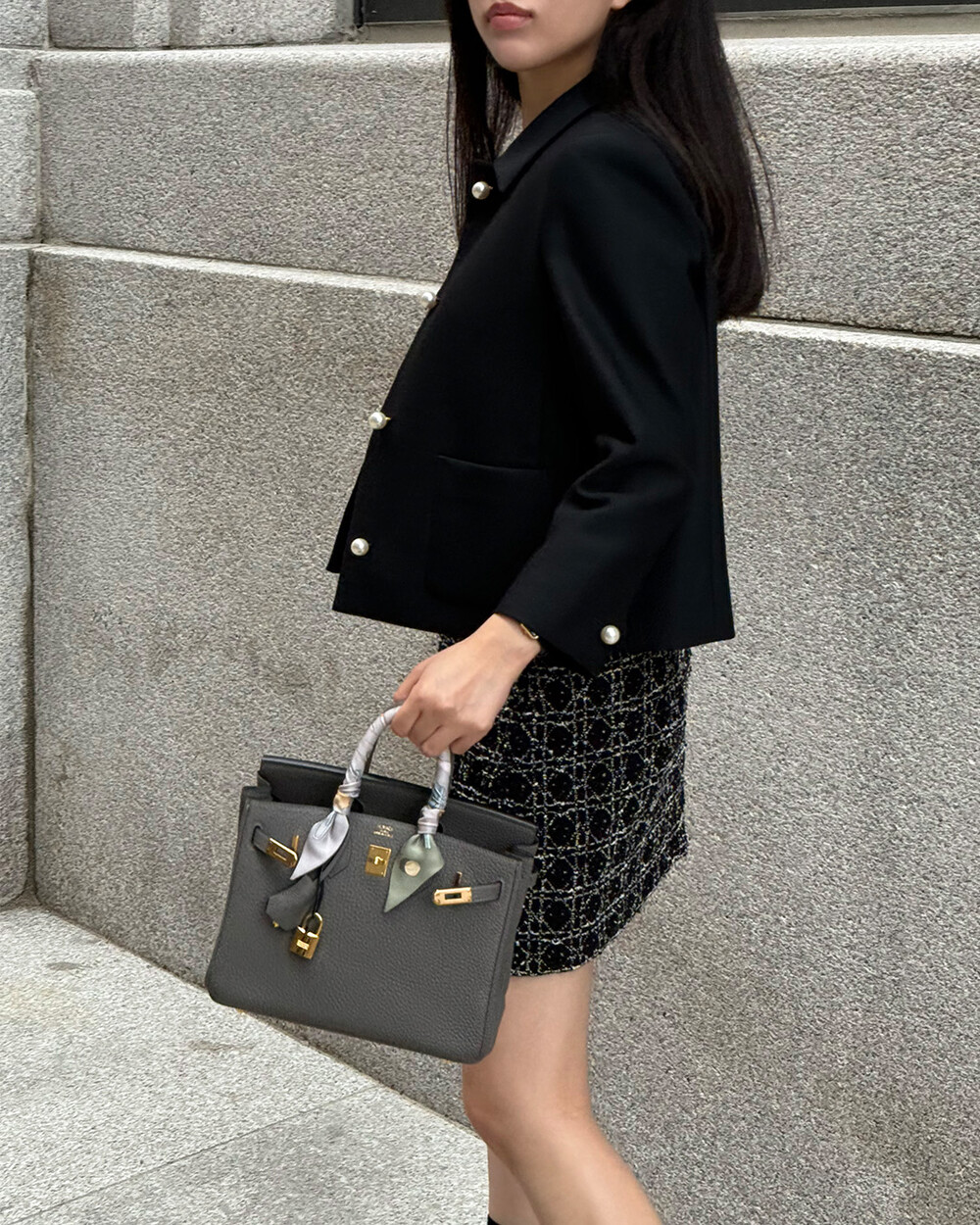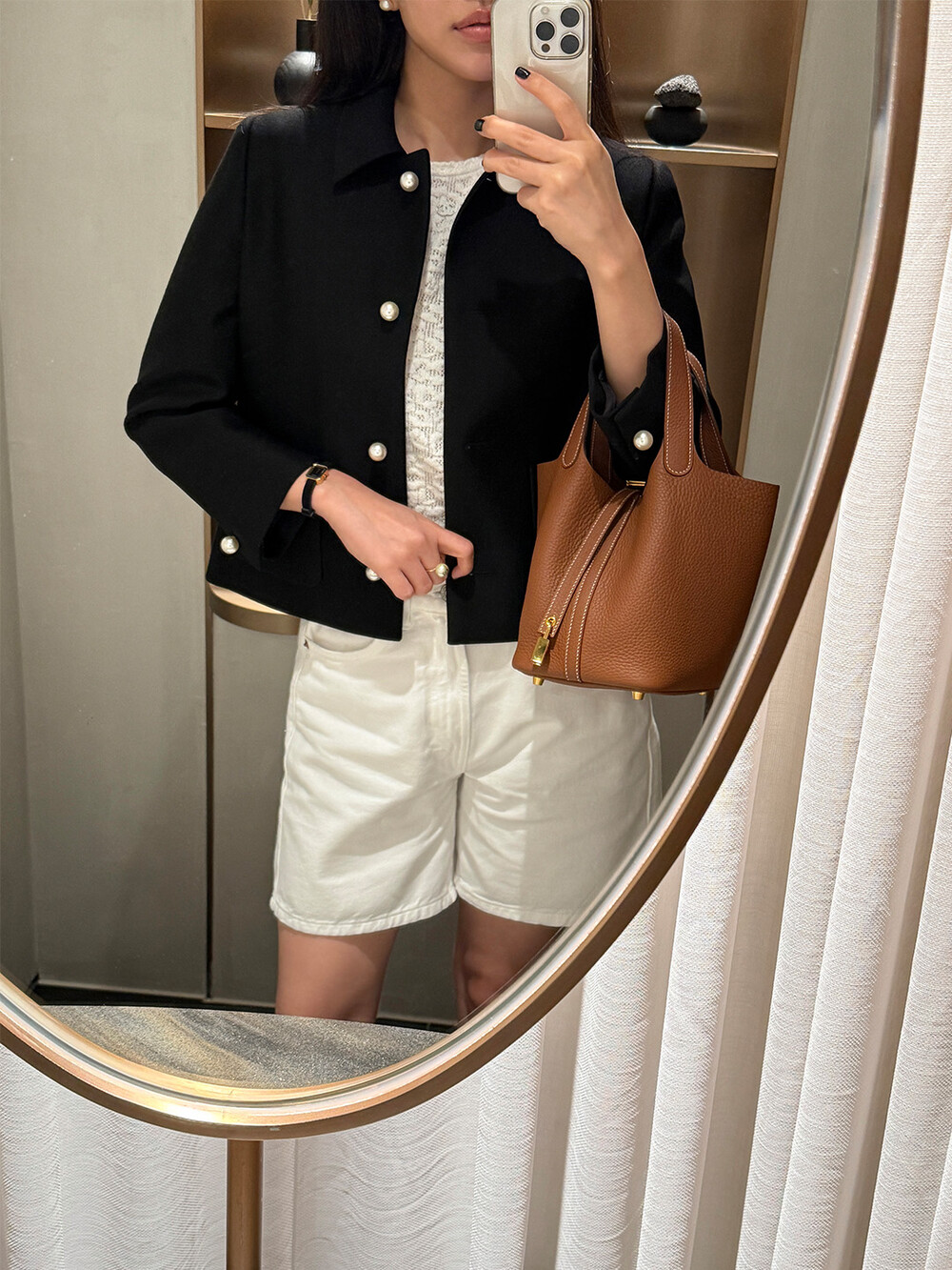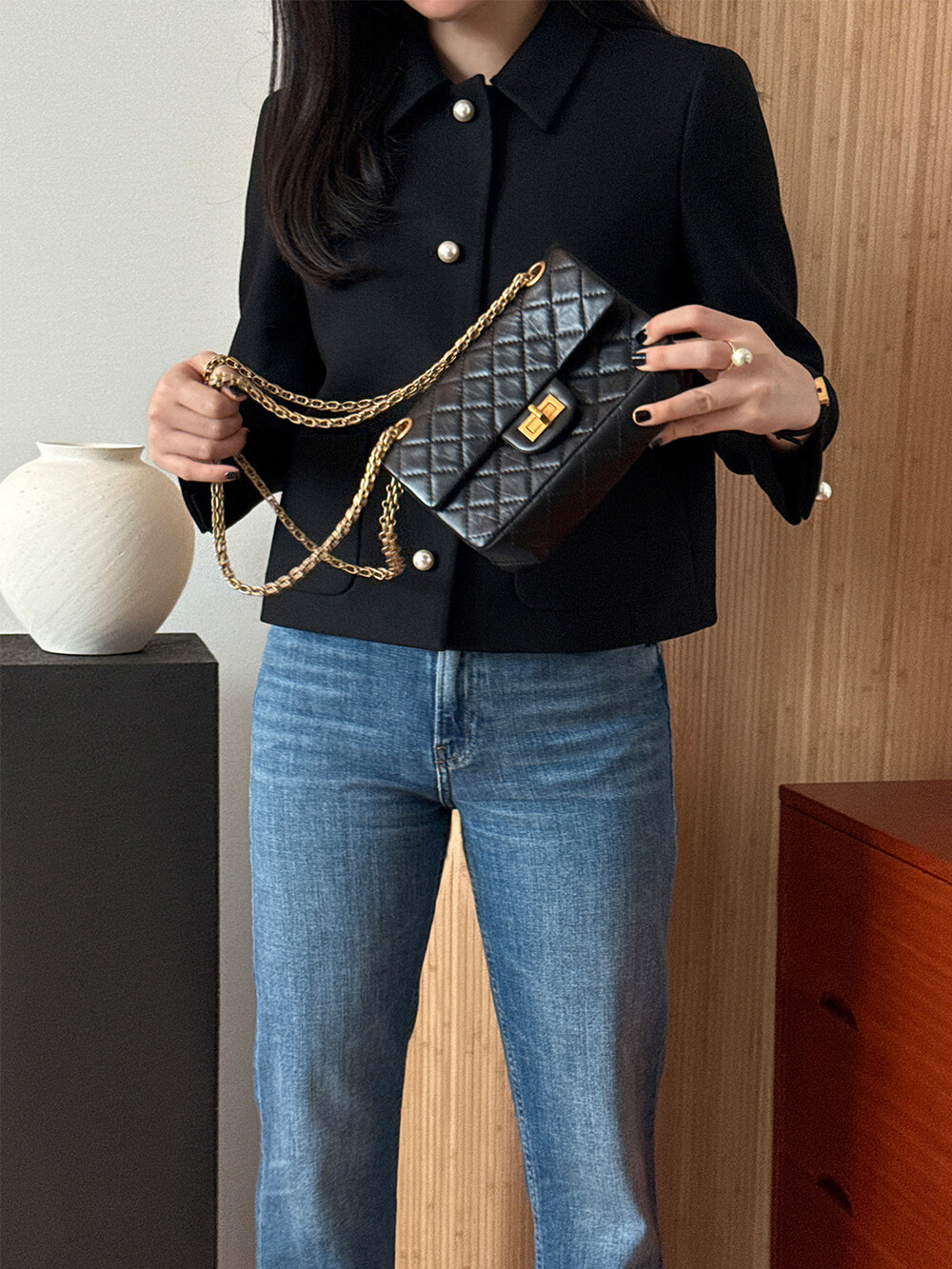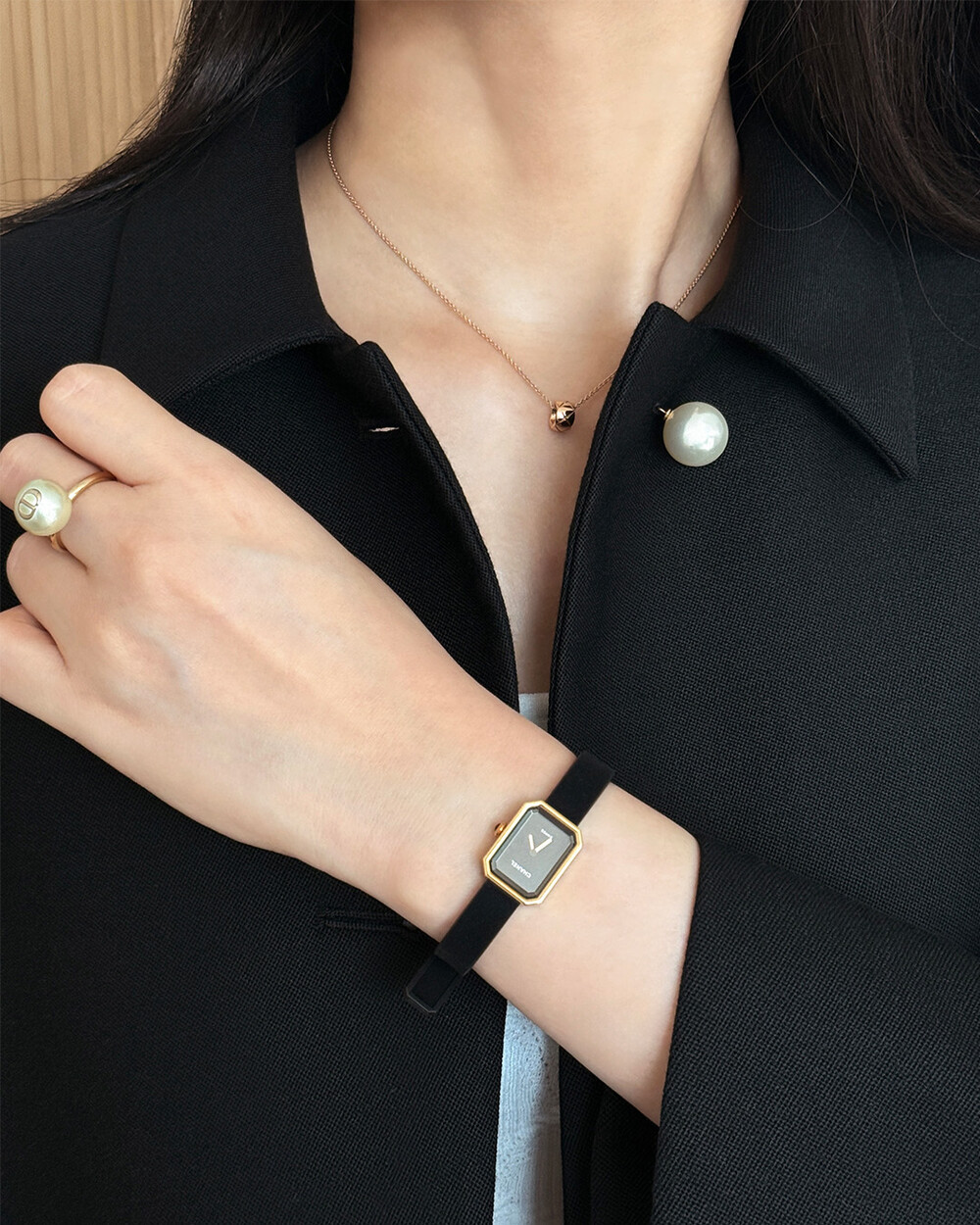 재킷의 소매는 가녀린 팔목 지점에 맞춰 떨어지도록 소매기장을 완성하였으며, 평소 애용하는 시계나 브레이슬릿과 같은 액세서리를 매칭할 때 자연스러운 어울림으로 설계된 소매장입니다. 앞면 클로저 제일 첫 단추가 자리한 앞단작 끝을 다림질로 젖혀주면 자연스러운 쁘띠 카라의 형태로 전환되어 새로운 스타일로서의 활용도를 제안합니다.