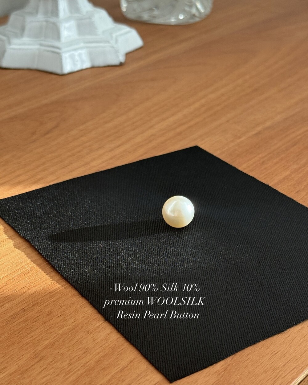 탄탄한 울 90%와 부드러운 실크 10% 혼방의 고급 울실크로 만들어졌습니다. 클린함 위에 한 포인트 더해진 원형의 펄 버튼이 이름처럼 차분하고 고요한 클래식을 표현합니다. 단단하고 은은한 진주단추는 그 자체만으로도 우아한 장식이 되어 줄 것입니다.