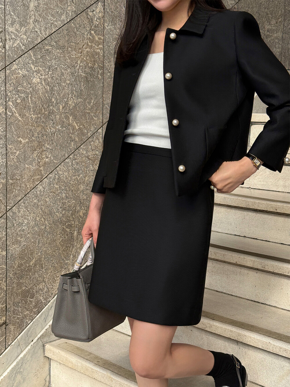 스커트는 플랫슈즈나 높은 굽, 어디에나 매칭하기 좋으며 격식있는 자리 뿐만 아니라 어느 날에도 데일리한 아름다움을 잃지 않게 해줍니다.